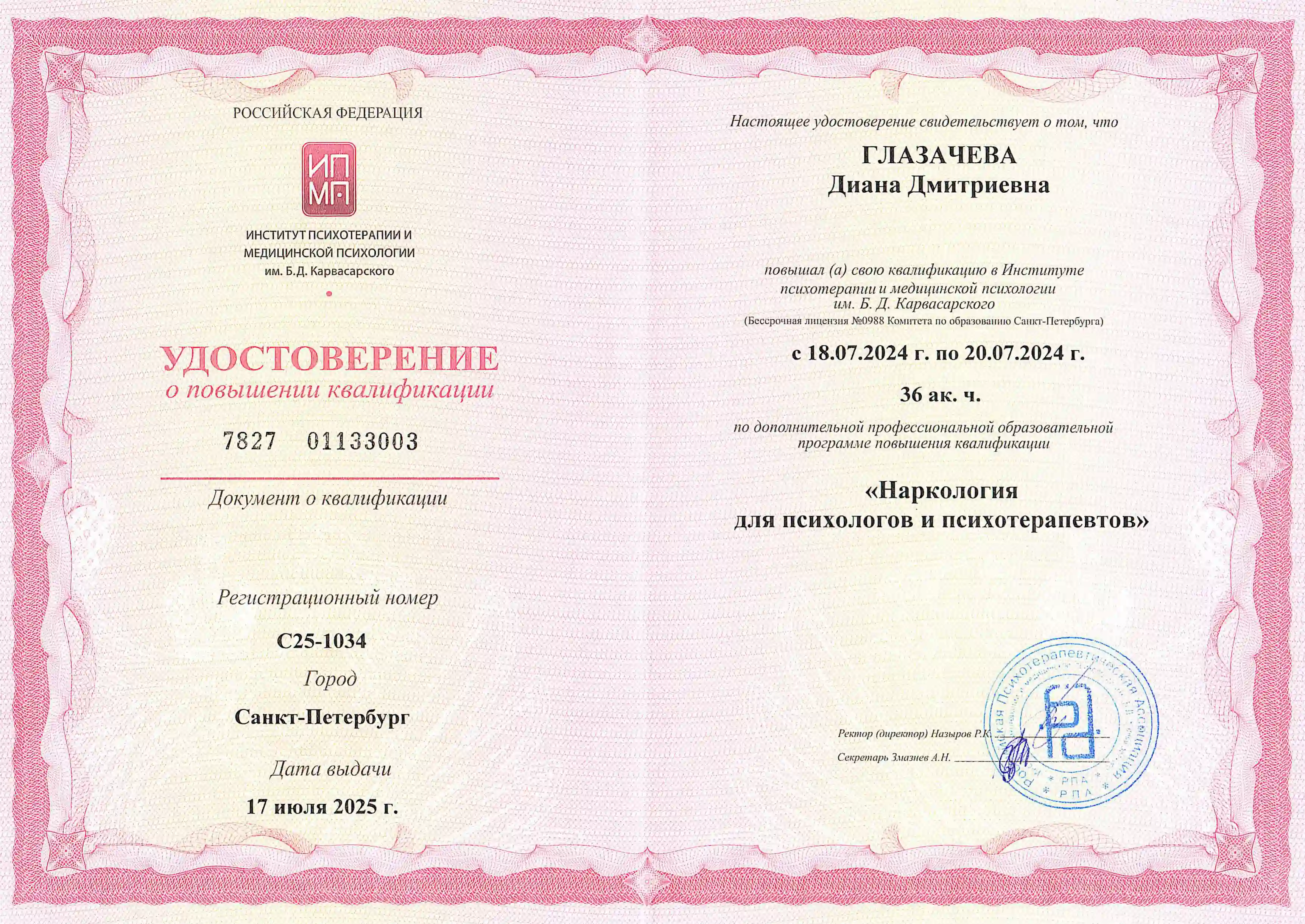 • 2025 — Сертифицированный специалист по методу эмоционально-стрессовой психотерапии зависимостей А.Р. Довженко. Московский Центр имени Довженко А.Р.